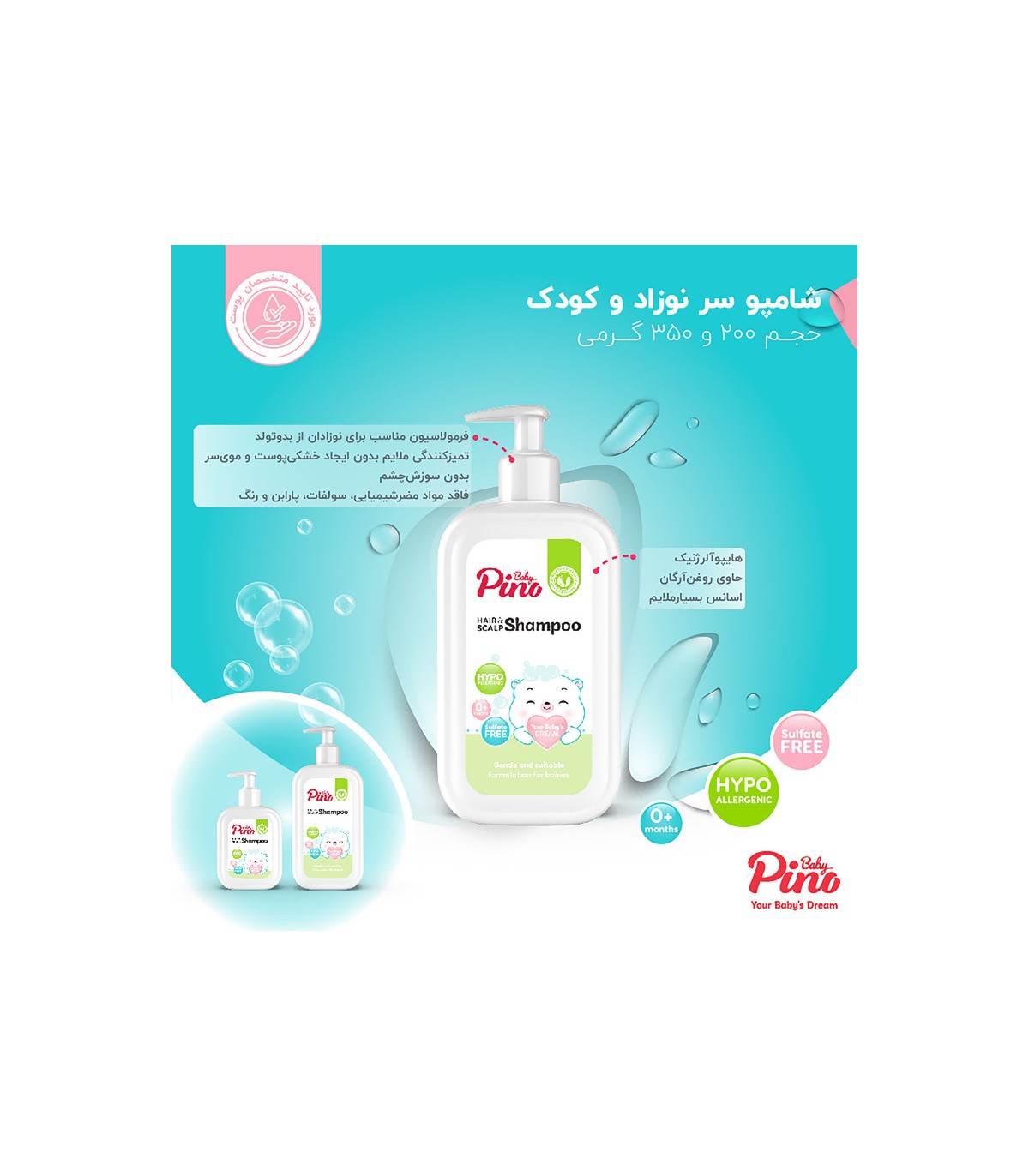 و نرمکننده است که مناسب برای پوست سر و موی نوزادان (از بدو تولد) و کودکان طراحی شده است. این شامپو با تمیزکنندگی مطلوب و رایحه ملایم خود، شادابی و لطافت مو را حفظ میکند. تمامی شامپوهای پینو بیبی با توجه به حساسیت پوست نوزادان تازه متولد شده و کودکان، فاقد مواد مضر شیمیایی مثل سولفات، پارابن و رنگ بوده و همچنین هنگام شست و شو سبب ایجاد حساسیت و سوزش چشم کودک نمیشوند. در ساختار فرمولاسیون شامپوها از اسانسهایی کاملاً هایپوآلرژنیک با رایحهای ملایم و دلپذیر استفاده شده که در کنار تمیزکنندگی مطلوبی که دارند، طراوت و شادابی را به پوست و موی نوزاد و کودک میبخشند.