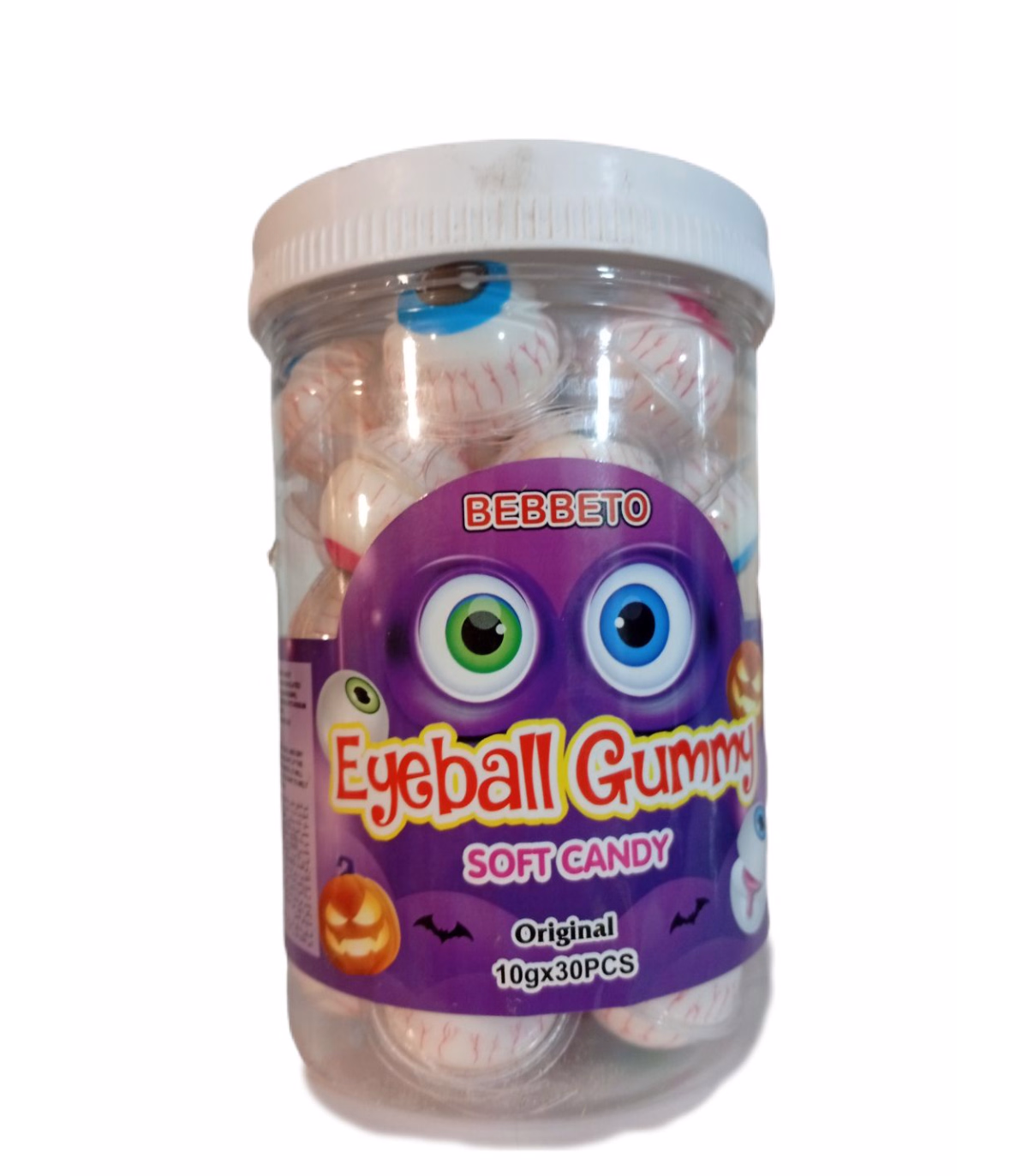 پاستیل چشمی سه‌بعدی Bebbeto بسته ۳۰ عددی (۳۰۰ گرم) با طعم میوه‌ای متنوع و مغز ژله‌ای نرم، انتخابی خاص و هیجان‌انگیز برای جشن، تولد و هالووین با بسته‌بندی سطلی شفاف و درب‌دار.