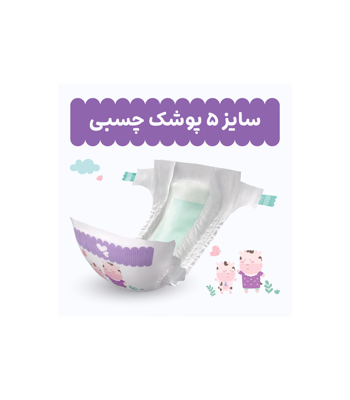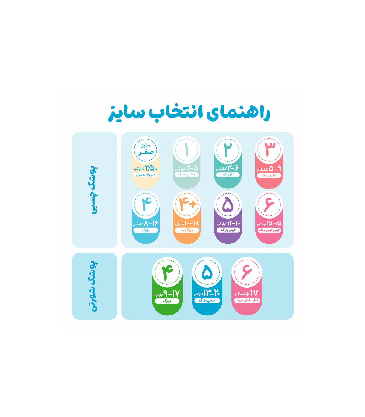 سایز خیلی بزرگ حاوی عصاره بابونه ضد حساسیت لایه رویی به نرمی پنبه لایه کشسان دور ران پا لایه رنگی فوق جاذب لایه بیرونی تنفسی لایه محافظ کشسان عمودی نوارهای کناری کشسان حاوی عصاره بابونه: برای محافظت از پوست در برابر حساسیت انحنای بند ناف برای جلوگیری از تماس پوشک با بند ناف نوزاد (در سایزهای نوزادی ۰ و ۱) لایه بیرونی تنفسی با قابلیت عبور هوا: برای راحتی بیشتر و محافظت از پوست در برابر حساسیت لایه رویی با حس نرمی پنبه: لطافت بیشتر برای پوست های حساس لایه جذب و انتشار: برای جذب و توزیع یکنواخت مایع در سطح پوشک کش های راحت دور ران: برای تناسب با آناتومی کودک و جلوگیری از نشت مایع چسب های مطمئن: چسب های قابل تنظیم و محکم (با قابلیت تنظیم چندباره) نوارهای کناری کشسان: برای انعطاف پذیری بیشتر در دور کمر کودک لایه محافظ کشسان عمودی: برای جلوگیری از نشتی کناره ها