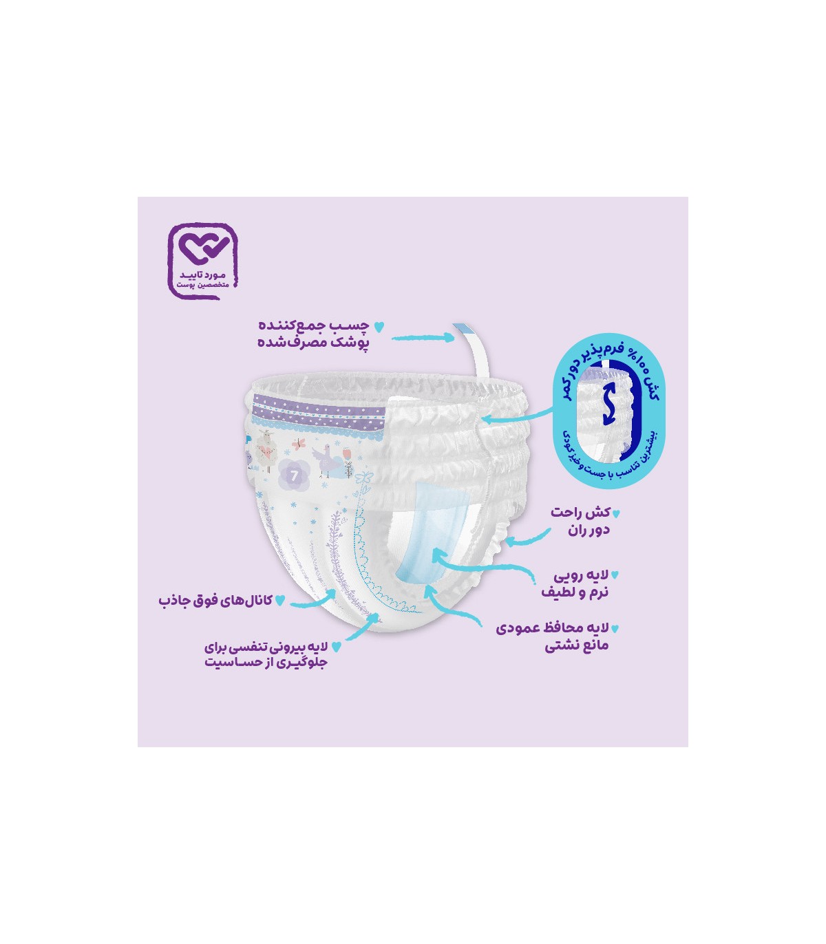 متناسب با آناتومی کودک، جلوگیری از نشت مایع، قدرت جذب بالا، قابلیت عبور هوا، کش کمر 360 درجه
