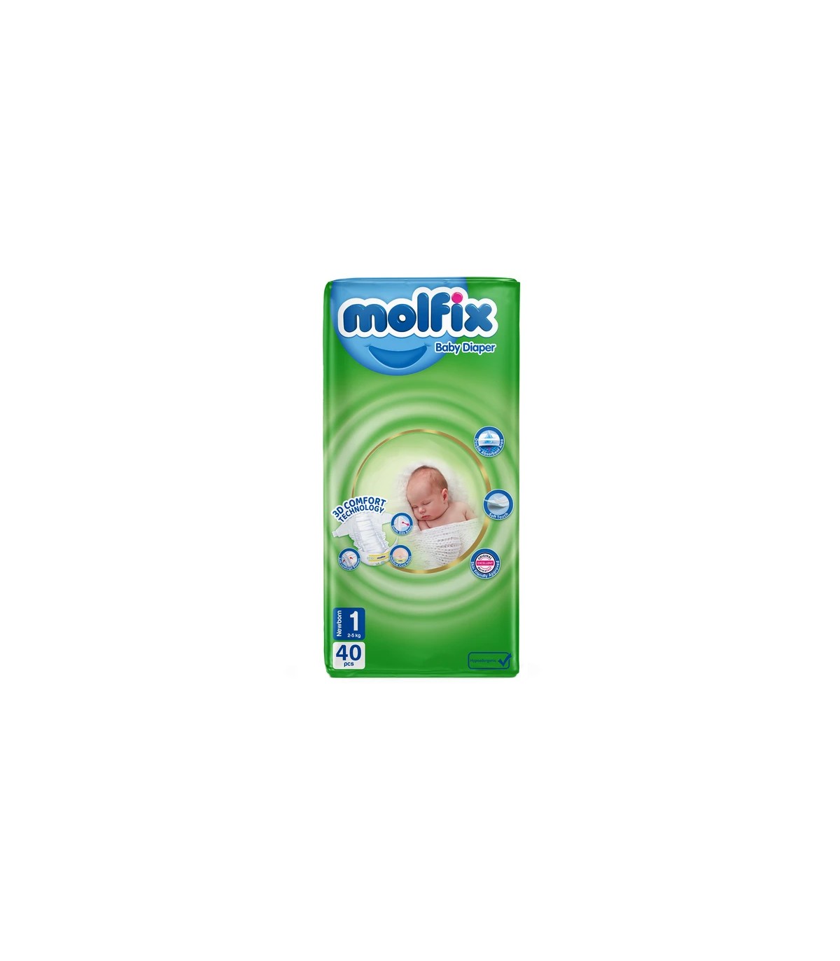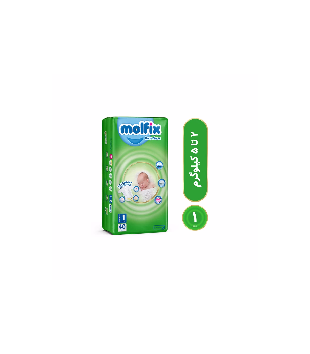پوشک مولفیکس مدل چسبی سایز 1 بسته 40 عددی به همراه دستمال مرطوب