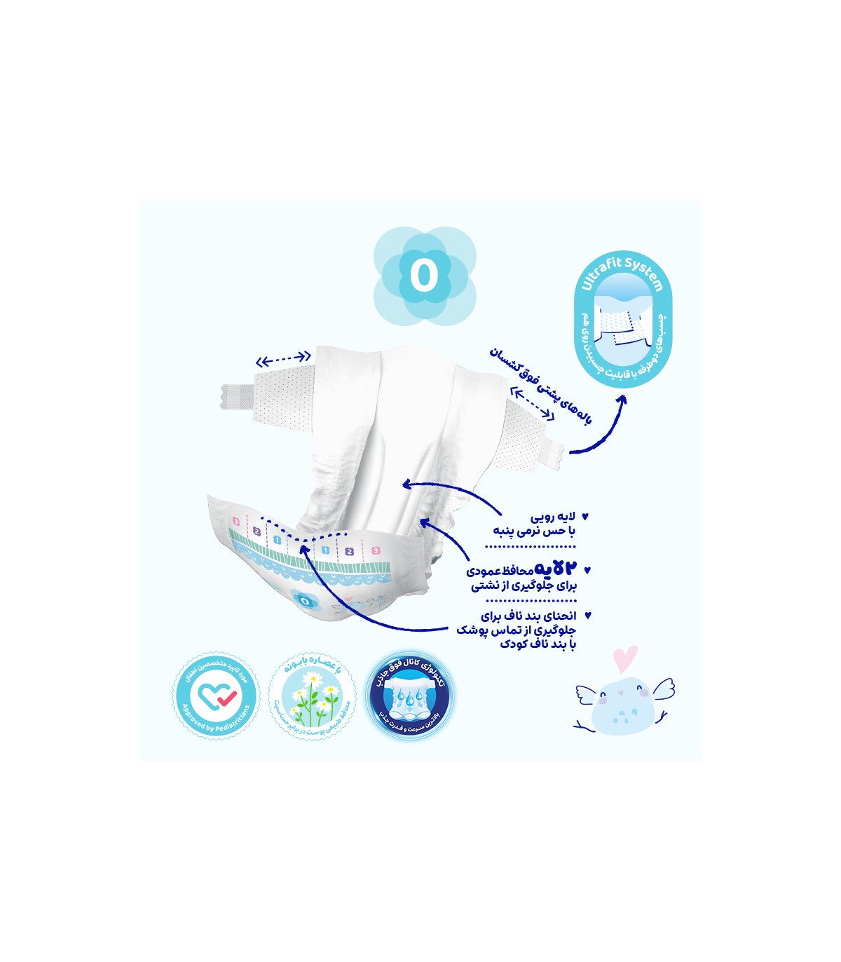 ویژگی پوشک کودک و نوزاد :لایه رویی نرم و لطیف، جلوگیری از نشت مایع، چسب‌های قابل تنظیم و محکم، لایه بیرونی تنفسی، قدرت جذب بالا، قابلیت عبور هوا