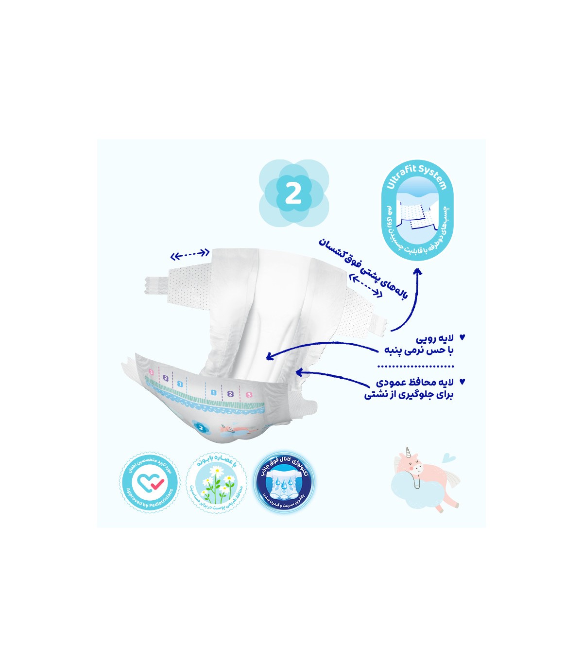 ویژگی پوشک کودک و نوزاد :جلوگیری از نشت مایع، لایه رویی نرم و لطیف، نوارهای کناری کشسان، قدرت جذب بالا، قابلیت عبور هوا