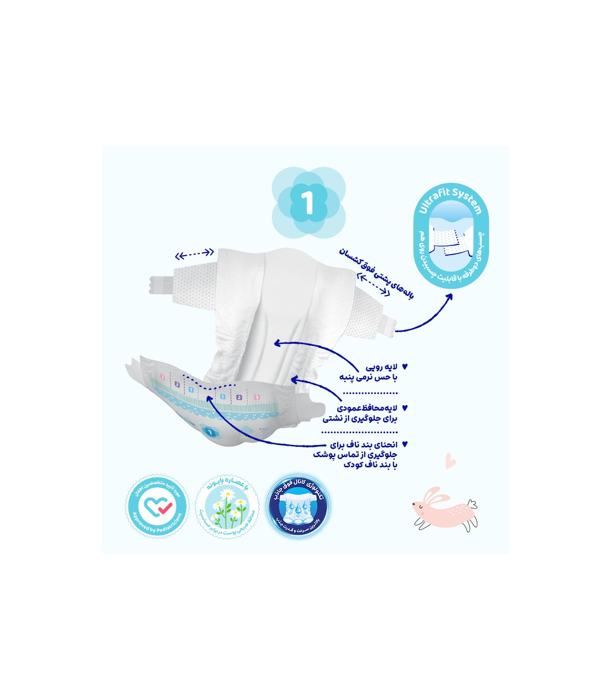 ویژگی پوشک کودک و نوزاد :جلوگیری از نشت مایع، لایه رویی نرم و لطیف، نوارهای کناری کشسان،...